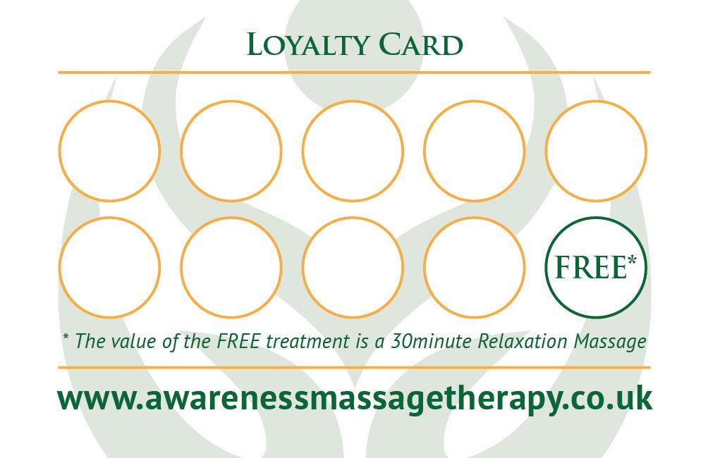 How it works: Collect a stamp with every treatment. After 9 stamps, your 10th visit includes a complimentary 30-minute relaxation massage. Ask for your stamp card at your next appointment.